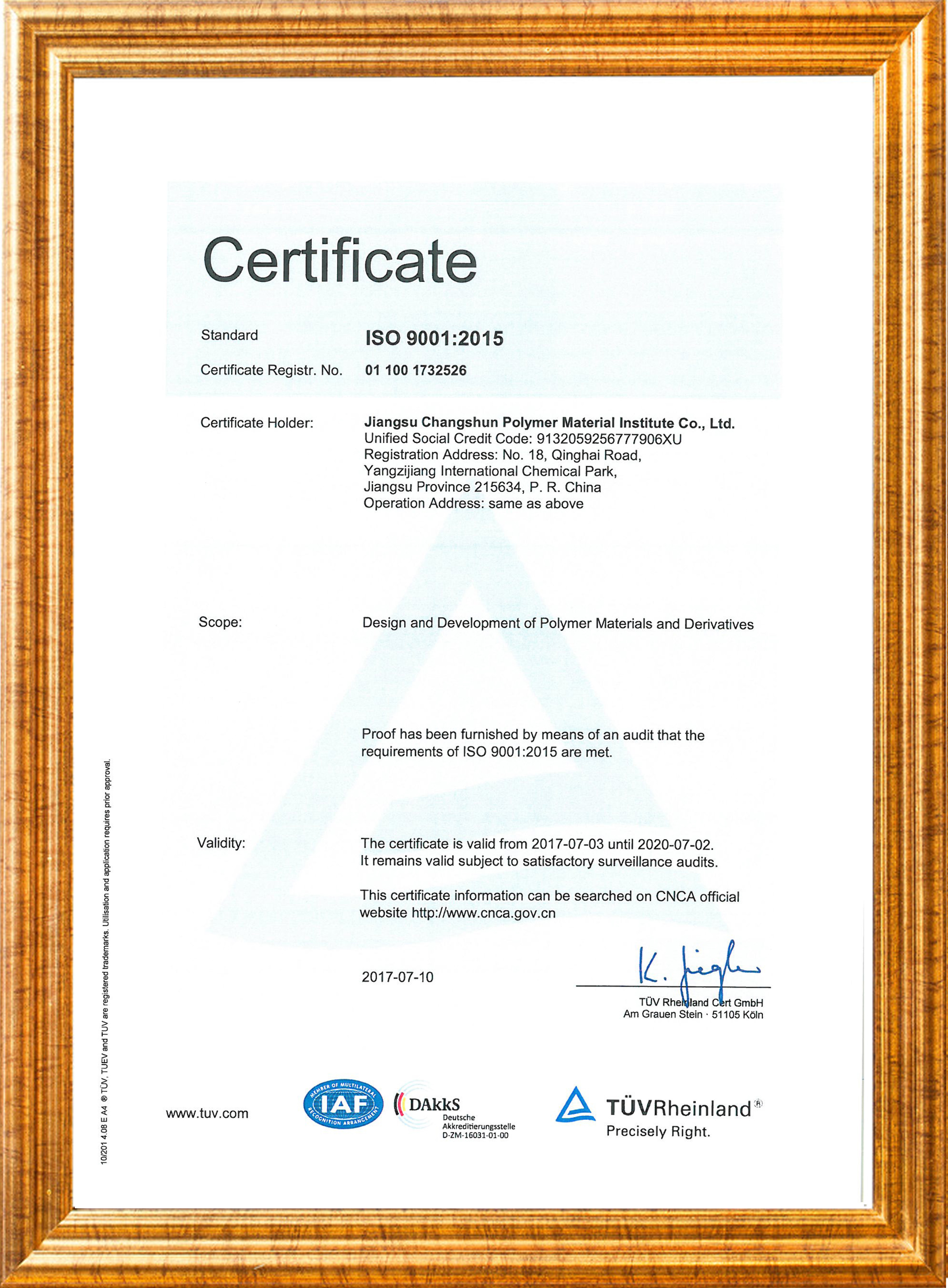 热烈祝贺江苏长顺高分子材料研究院有限公司顺利通过ISO9001:2015质量管理体系认证