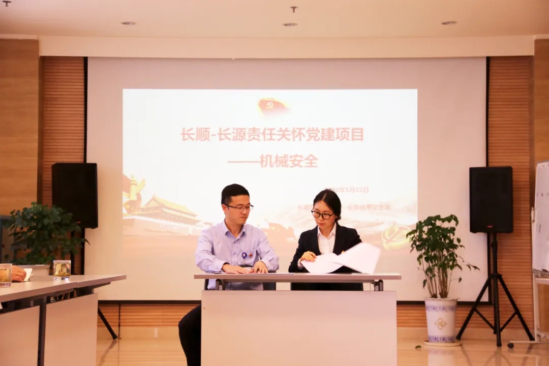 “长顺--长源”责任关怀党建项目共有十二个主题,在正式主题学习之前,长顺集团党总支书记与长源热电党支部书记签署“长顺-长源”责任关怀责任书;随后,正式开展本次第一个学习主题--机械安全,长华化学党支部委员黄萍围绕“机械安全”做成果经验的培训与分享。